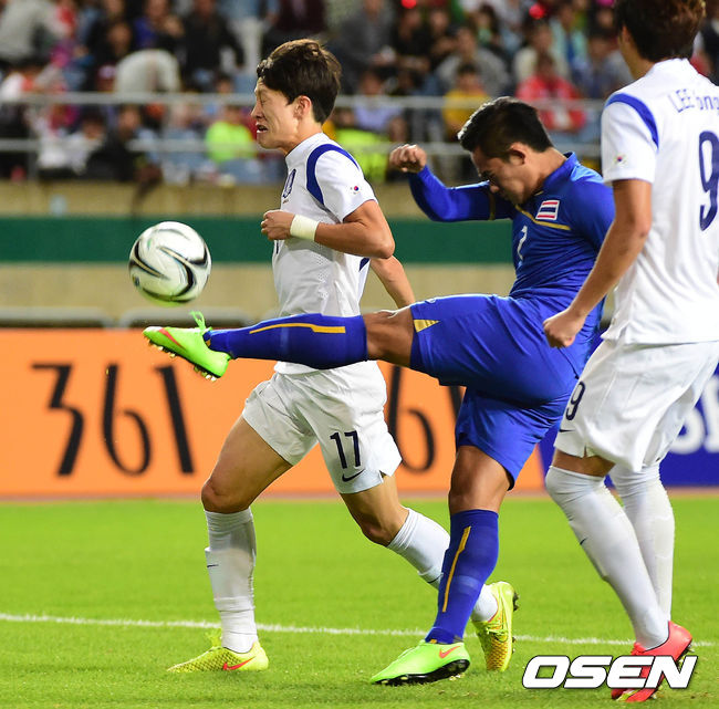 30일 오후 인천 문학경기장에서 열린 제17회 인천 아시안게임 남자 축구 4강전 한국과 태국의 경기 전반 이재성이 문전에서 볼을 뺏기고 있다.