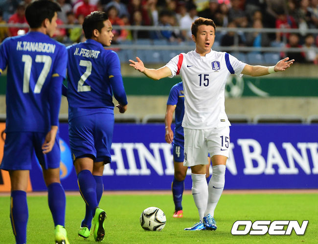 30일 오후 인천 문학경기장에서 열린 제17회 인천 아시안게임 남자 축구 4강전 한국과 태국의 경기 전반 임창우가 심판의 판정에 어필하고 있다.