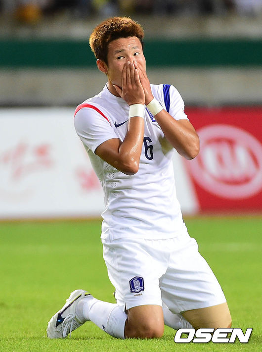 30일 오후 인천 문학경기장에서 열린 제17회 인천 아시안게임 남자 축구 4강전 한국과 태국의 경기 전반 손준호가 자신의 슛이 빗나가자 아쉬워 하고 있다.