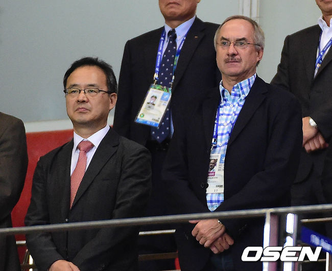 30일 오후 인천 문학경기장에서 열린 제17회 인천 아시안게임 남자 축구 4강전 한국과 태국의 경기 시작전 슈틸리케 감독과 이용수 기술위원장이 귀빈석에 서 있다.