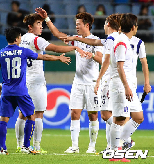 이광종 감독이 이끄는 축구대표팀은 30일 오후 8시 인천 문학경기장에서 열린 2014 인천아시안게임 대회 남자 축구 4강전서 전반 41분 이종호의 헤딩 선제골과 전반 45분 장현수의 페널티킥 추가골에 힘입어 태국을 2-0으로 제압했다.