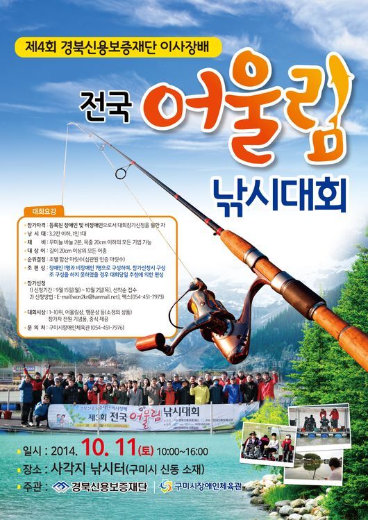 경북신용보증재단(이사장 김종규)과 구미시장애인체육관(관장 김숙희)은 오는 10월 11일 구미시 신동 소재의 사각지 낚시터에서 '제4회 경북신용보증재단 이사장배 전국어울림낚시대회'를 개최한다.