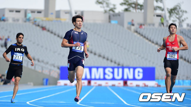 1일 오전 인천 아시아드 주경기장에서 열린 제17회 인천 아시안게임 육상 남자 200m 준결승에서 여호수아가 1위로 골인 하고 있다.