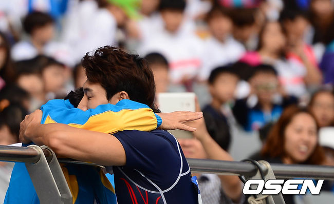 1일 오전 인천 아시아드 주경기장에서 열린 제17회 인천 아시안게임 육상 남자 200m 준결승에서 1위를 기록한 여호수아가 경기 후 선수촌 목사와 포옹을 하고 있다.