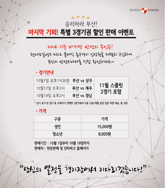 매 경기 결승전과 같은 경기가 남은 부산은 3경기 특별 할인 패키지 티켓을 판매해 팬들을 축구장으로 모은다. 3경기 특별권은 시즌권 구매를 못했으나 남은 경기를 저렴하게 보고 싶은 축구팬에게 적합한 상품이다.
