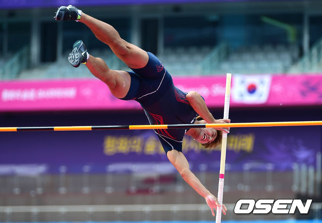 1일 오전 인천 아시아드 주경기장에서 열린 제17회 인천 아시안게임 육상 남자 10종경기에서 배상화가 장대높이뛰기를 하고 있다.