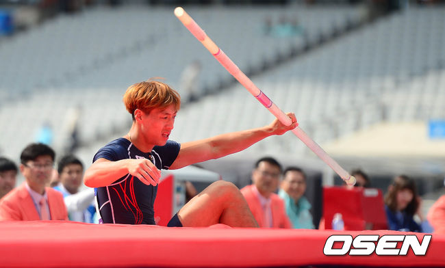 1일 오전 인천 아시아드 주경기장에서 열린 제17회 인천 아시안게임 육상 남자 10종경기 장대높이뛰기에서 배상화가 장애물 넘기 실패 후 아쉬워 하고 있다.