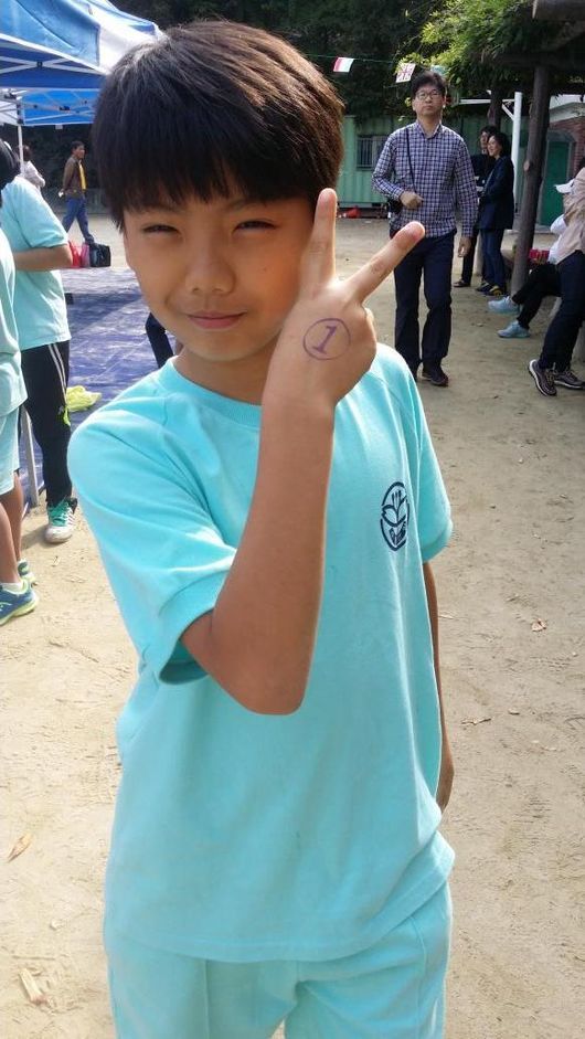 공개된 사진 속 김단율은 푸른 색 체육복을 위아래로 맞춰 입은 채 카메라를 향해 1등 기념 도장이 찍혀있는 손등을 보이며 손가락 브이를 그리고 있다.