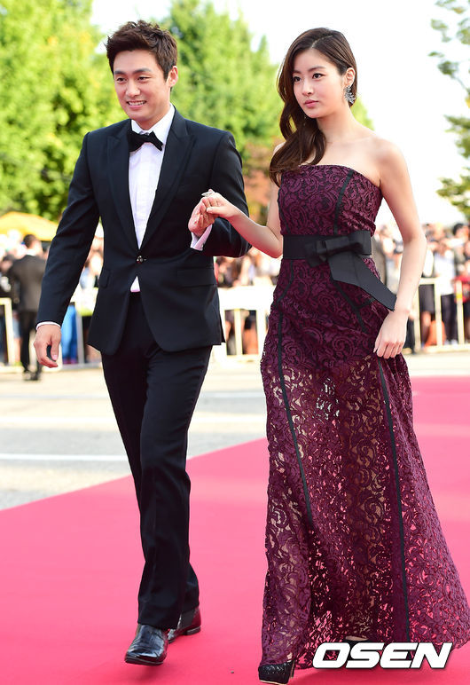 배우 강소라와 방송인 오상진이 시상식에 참석해 레드카펫을 밟고 있다.