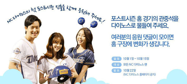 이번 이벤트는 NC 다이노스 홈페이지를 통해 NC 다이노스의 포스트시즌 진출 및 활약을 기원하는 응원 댓글을 작성하는 방식으로 진행된다. 이벤트 참가자를 대상으로 추첨을 통해 경품을 증정하고 포스트시즌 첫 홈 경기 시 현장에서 응원도구를 무료로 배포한다.