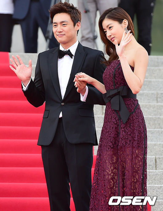 배우 강소라와 방송인 오상진이 시상식에 참석해 레드카펫을 밟고 있다.