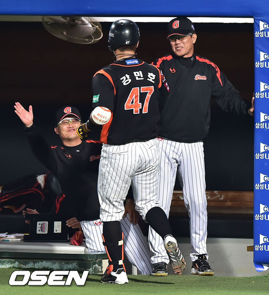 1일 오후 대구 시민구장에서 '2014 한국야쿠르트 세븐 프로야구' 삼성 라이온즈와 롯데 자이언츠 경기가 열렸다. 2회초 1사 롯데 강민호가 좌월 동점 솔로 홈런을 날린 후 덕아웃에서 김시진 감독과 하이파이브를 하고 있다.