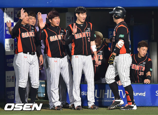 1일 오후 대구 시민구장에서 '2014 한국야쿠르트 세븐 프로야구' 삼성 라이온즈와 롯데 자이언츠 경기가 열렸다. 2회초 1사 롯데 강민호가 좌월 동점 솔로 홈런을 날린 후 덕아웃에서 동료들과 하이파이브를 하고 있다.