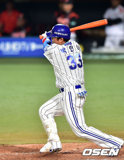 1일 오후 대구 시민구장에서 '2014 한국야쿠르트 세븐 프로야구' 삼성 라이온즈와 롯데 자이언츠 경기가 열렸다. 2회말 2사 주자 1루 삼성 박한이가 우익수 오른쪽 1타점 3루타를 날리고 있다.