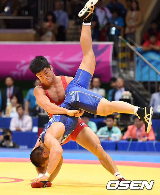 김현우는 1일 인천 도원체육관에서 열린 2014 인천아시안게임 레슬링 남자 그레고로만형 75kg 결승전에서 가나쿠보 다케히로(일본)를 4-0으로 제압하고 금메달을 목에 걸었다.
