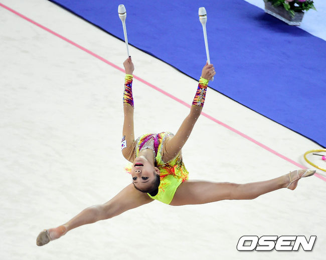 1일 오후 인천 남동체육관에서 열린 제17회 인천 아시안게임 리듬체조 개인 예선 및 단체전 경기에서 이나경이 곤봉연기를 펼치고 있다.