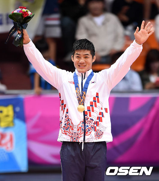 한국 김현우가 시상대에서 환호하고 있다. /sunday@osen.co.kr