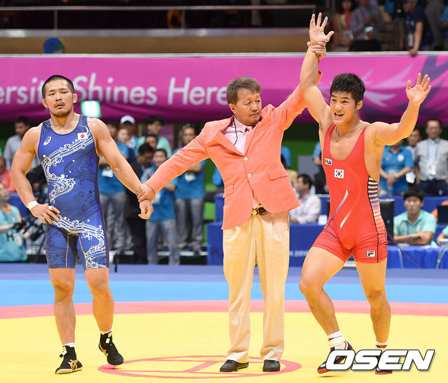 김현우는 1일 인천 도원체육관에서 열린 2014 인천아시안게임 레슬링 남자 그레고로만형 75kg 결승전에서 가나쿠보 다케히로(일본)를 4-0으로 제압하고 금메달을 목에 걸었다.