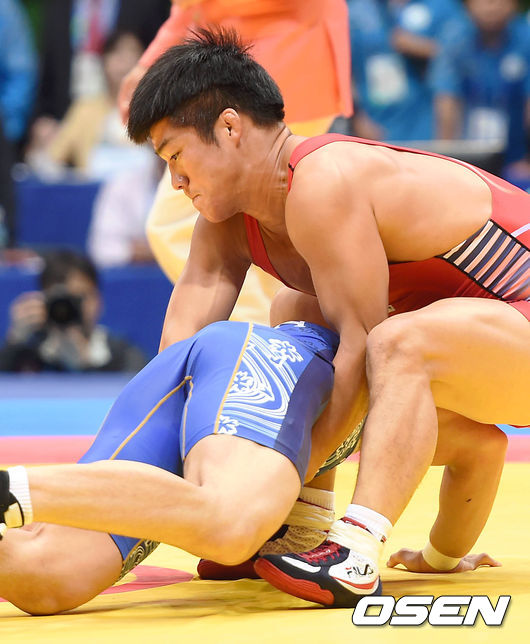 김현우는 1일 인천 도원체육관에서 열린 2014 인천아시안게임 레슬링 남자 그레고로만형 75kg 결승전에서 가나쿠보 다케히로(일본)를 4-0으로 제압하고 금메달을 목에 걸었다.