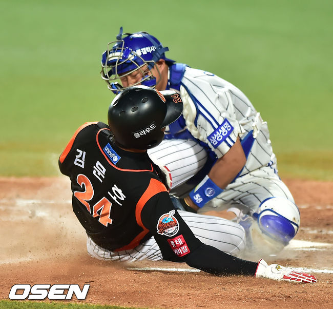 1일 오후 대구 시민구장에서 '2014 한국야쿠르트 세븐 프로야구' 삼성 라이온즈와 롯데 자이언츠 경기가 열렸다. 6회초 1사 주자 만루 롯데 정훈이 역전 1타점 적시타때 2루 주자 김문호가 홈에서 삼성 이지영에게 태그아웃을 당하고 있다.