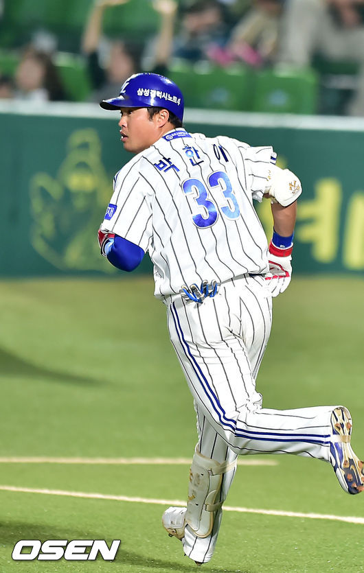 1일 오후 대구 시민구장에서 '2014 한국야쿠르트 세븐 프로야구' 삼성 라이온즈와 롯데 자이언츠 경기가 열렸다. 8회초 선두타자 삼성 박한이가 좌월 동점 솔로홈런을 날린 후 타구를 바라보고 있다.
