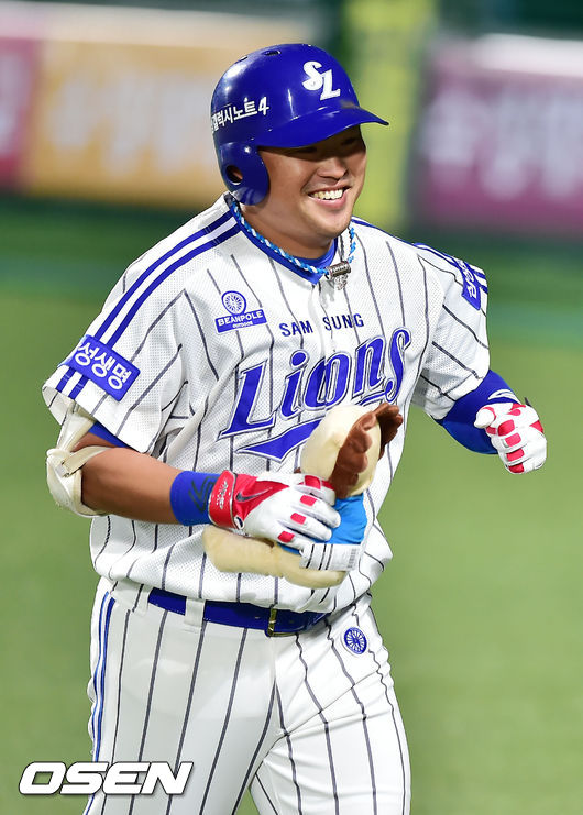 1일 오후 대구 시민구장에서 '2014 한국야쿠르트 세븐 프로야구' 삼성 라이온즈와 롯데 자이언츠 경기가 열렸다. 8회초 선두타자 삼성 박한이가 좌월 동점 솔로홈런을 날린 후 덕아웃으로 향하며 미소짓고 있다.