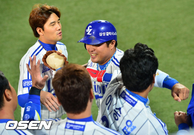 1일 오후 대구 시민구장에서 '2014 한국야쿠르트 세븐 프로야구' 삼성 라이온즈와 롯데 자이언츠 경기가 열렸다. 8회초 선두타자 삼성 박한이가 좌월 동점 솔로홈런을 날린 후 덕아웃에서 동료들과 하이파이브를 하고 있다.