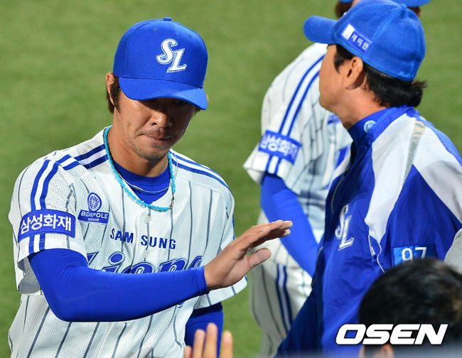 1일 오후 대구 시민구장에서 '2014 한국야쿠르트 세븐 프로야구' 삼성 라이온즈와 롯데 자이언츠 경기가 열렸다. 9회초를 막아낸 삼성 임창용이 덕아웃으로 향하며 하이파이브를 하고 있다.