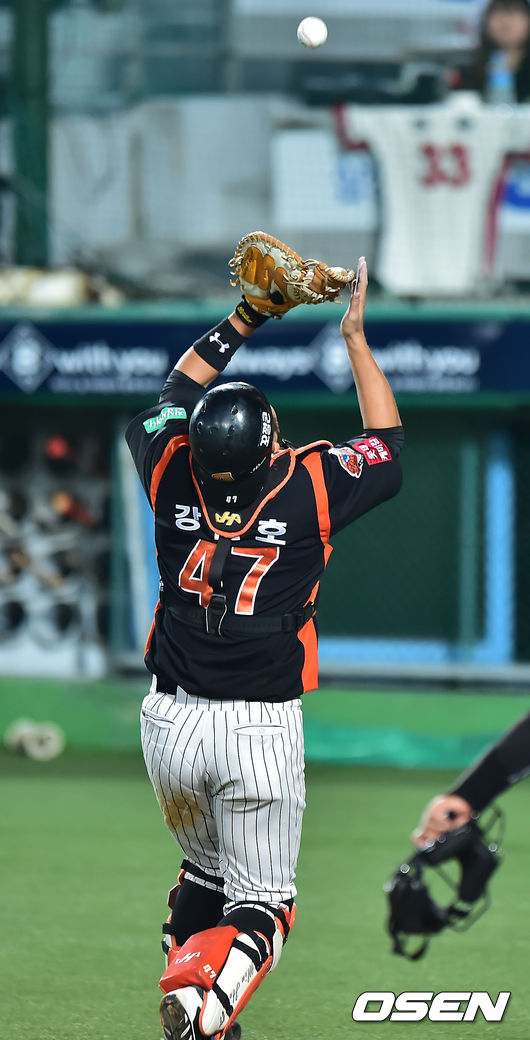 1일 오후 대구 시민구장에서 '2014 한국야쿠르트 세븐 프로야구' 삼성 라이온즈와 롯데 자이언츠 경기가 열렸다. 9회말 무사 주자 1루 삼성 박해민의 번트 파울 타구를 강민호가 처리하고 있다.