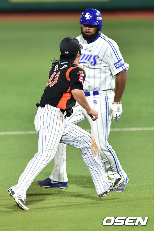 1일 오후 대구 시민구장에서 '2014 한국야쿠르트 세븐 프로야구' 삼성 라이온즈와 롯데 자이언츠 경기가 열렸다. 연장 10회말 1사 주자 1루 삼성 박한이의 땅볼 타구때 볼을 잡은 롯데 2루수 정훈이 나바로에게 태그를 시도하고 있다. 이때 나바로가 뒤로 물러서며 쓰리피트를 벗어나고 있다.