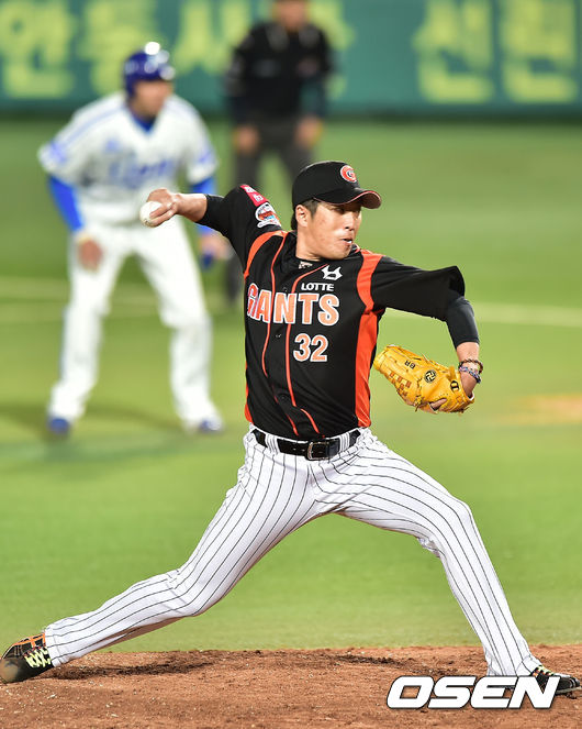 1일 오후 대구 시민구장에서 '2014 한국야쿠르트 세븐 프로야구' 삼성 라이온즈와 롯데 자이언츠 경기가 열렸다. 연장 10회말 2사 주자 1,3루 삼성 최형우 타석에서 마운드에 오른 롯데 김승회가 힘차게 공을 뿌리고 있다.