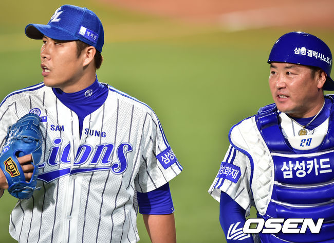 1일 오후 대구 시민구장에서 '2014 한국야쿠르트 세븐 프로야구' 삼성 라이온즈와 롯데 자이언츠 경기가 열렸다. 연장 11회초를 마친 삼성 권혁이 큰 숨을 내쉬며 덕아웃으로 향할때 진갑용이 말을 걸고 있다.