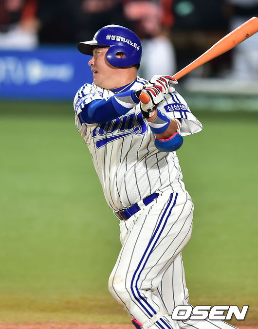 1일 오후 대구 시민구장에서 '2014 한국야쿠르트 세븐 프로야구' 삼성 라이온즈와 롯데 자이언츠 경기가 열렸다. 연장 12회말 삼성 진갑용이 투수 땅볼 타구를 날리고 있다.