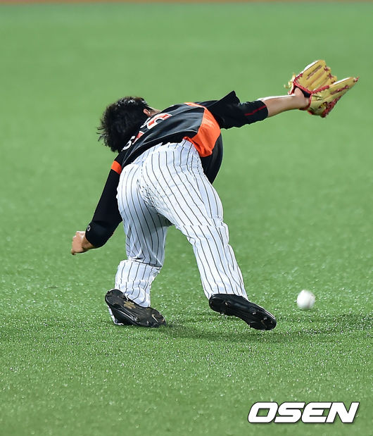 연장 12회말 2사 주자 1루 삼성 박한이가 좌익수 오른쪽 뜬공을 날려 롯데 좌익수 하준호가 몸을 날렸으나 잡아내지 못하며 끝내기 안타가 되고 있다. / rumi@osen.co.kr