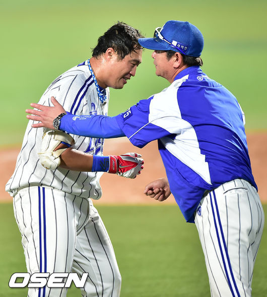 연장 12회말 2사 주자 1루 삼성 박한이가 좌익수 오른쪽 뜬공을 날려 롯데 좌익수 하준호가 몸을 날렸으나 잡아내지 못하며 끝내기 안타가 된 후 끝내기 물 세례를 받은 후 류중일 감독과 악수를 나누고 있다. / rumi@osen.co.kr