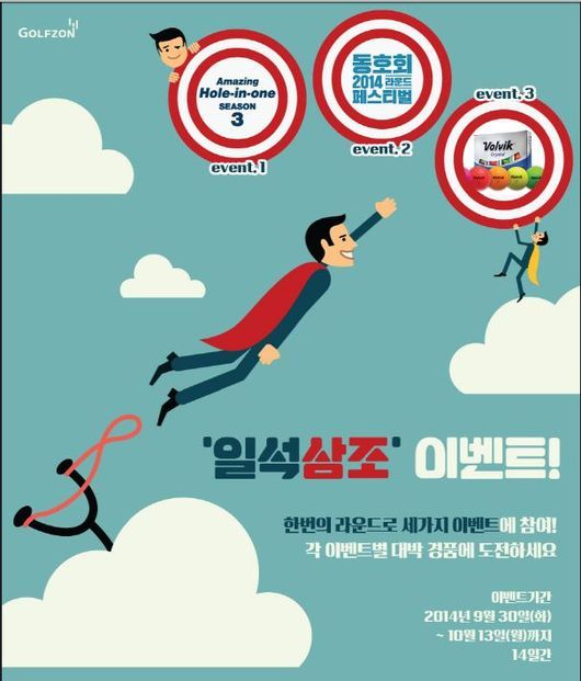 이번 '일석삼조 이벤트'는 골프존에서 1억 5000만 원 상당의 시상품을 제공하는 '2014 동호회 페스티벌'과 2억원 규모로 개최되는 '어메이징 홀인원 시즌3, 가을편'에 동시에 참여할 수 있는 행사이다. 이번 이벤트에 참가하는 골퍼는 추첨을 통해 볼빅 크리스탈 3피스 1더즌까지 무료로 받을 수 있다.