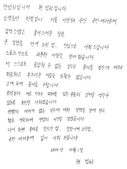 이후 현 감독은 자필 편지를 통해 “저 스스로도 용납할 수 없는 실수로 물의를 빚은데 대해 죄송하고 부끄러운 마음을 금할 수 없습니다”면서 “고개 숙여 용서를 구합니다. 무엇보다 저로 인해 피해를 입은 분들의 상처를 씻을 수 있도록 최선을 다하겠습니다”라고 밝혔다.
