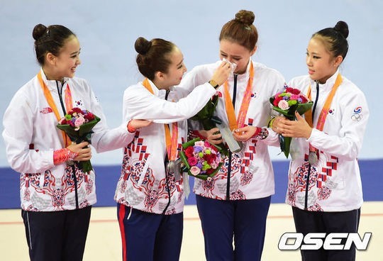 손연재의 뒤를 받쳐줘야 할 김윤희가 연속 실수를 하면서 한국의 메달 전망이 어두워졌다. 결국 복받치는 감정을 이기지 못한 김윤희는 키스앤크라이존에서 눈물을 보였다. 김윤희가 제 역할을 못해주면 박빙의 승부에서 밀려 메달획득이 좌절되는 순간이었다.