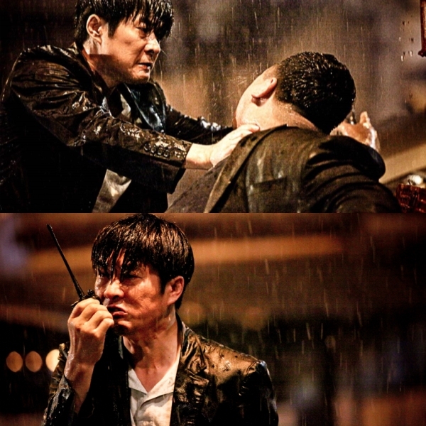 사진에서 김상중은 본인보다 훨씬 큰 거구의 상대를 잡아먹을 듯한 살벌한 눈빛으로 제압하고 있다. 굵은 빗줄기 속에서도 숨길 수 없는 김상중의 강렬한 연기가 시선을 사로잡고 있다.