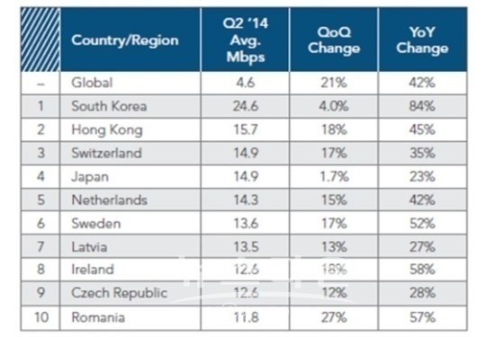 인터넷 평균접속속도 부문에서는 한국이 24.6Mbps로 부동의 1위를 유지했다. 2위 홍콩(15.7Mbps)과의 격차는 무려 8.9Mbps나 된다.