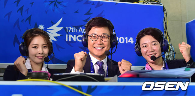 경기에 앞서 MBC 해설위원 신수지, 차상은과 김성주 캐스터가 취재진을 향해 포즈를 취하고 있다.