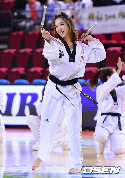 2일 오후 인천 삼산월드체육관에서 열린 제17회 인천 아시안게임 여자 농구 결승전 한국과 중국의 경기 시작전 치어리더들이 태권도 시범을 선보이고 있다.
