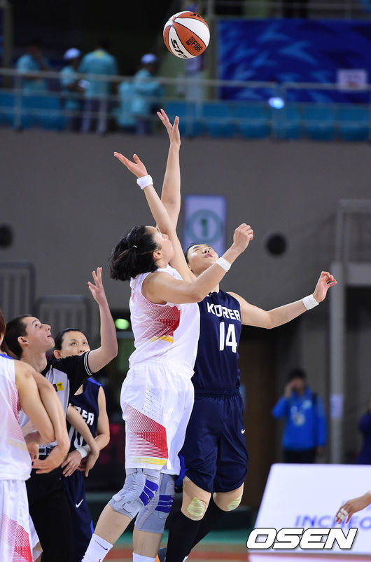 2일 오후 인천 삼산월드체육관에서 열린 제17회 인천 아시안게임 여자 농구 결승전 한국과 중국의 경기 1쿼터 강영숙이 점프볼을 다투고 있다.