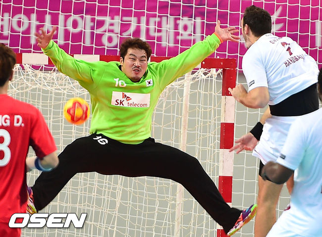 2일 오후 인천 선학핸드볼경기장에서 열린 '2014 인천 아시안게임' 남자 핸드볼 한국과 카타르의 결승전, 전반 이동명 골키퍼가 슛을 막아내고 있다
