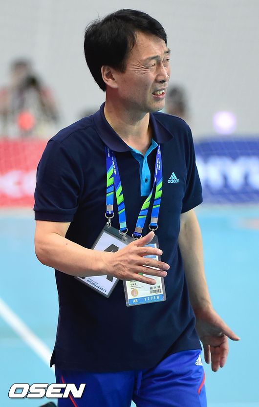 2일 오후 인천 선학핸드볼경기장에서 열린 '2014 인천 아시안게임' 남자 핸드볼 한국과 카타르의 결승전, 후반 김태훈 감독이 아쉬워하고 있다.
