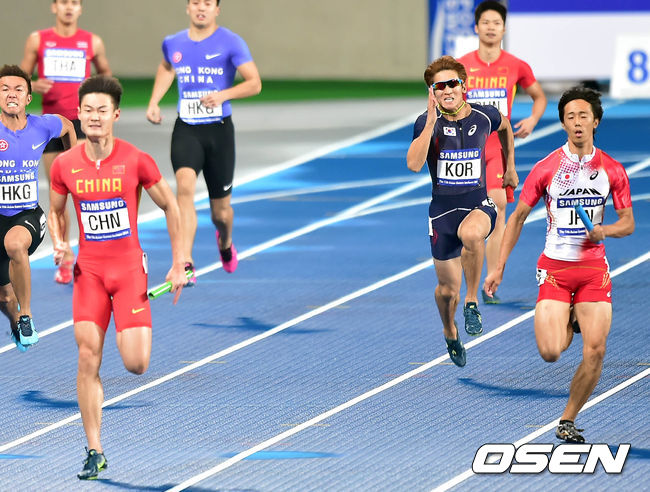 2일 오전 인천 아시아드 주경기장에서 열린 제17회 인천 아시안게임 육상 남자 400m 계주에서 여호수아·조규원·오경수·김국영 순으로 달린 한국 계주팀이  39초19의 기록으로 5위에 그쳤다.