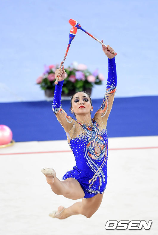 우즈베키스탄 자밀라 라크마토바가 곤봉 연기를 펼치고 있다.