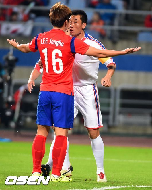 2일 오후 인천 문학월드컵경기장에서 열린 '2014 인천 아시안게임' 남자 축구 한국과 북한의 결승전, 전반 이종호와 북한 장성혁이 말다툼을 하고 있다