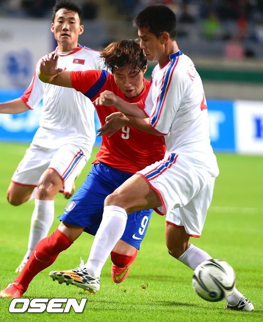 초반부터 북한은 한국을 거세게 압박했다. 전반 9분 서현욱의 슈팅으로 이날 경기 첫 번째 유효슈팅을 기록한 북한은 거친 몸싸움으로 한국을 막아내며 경기를 끌고 갔다. 한국은 전반 12분 김진수가 깊숙히 날린 왼발 크로스가 리명국 골키퍼에게 가로막히고, 여기에 김철범과 충돌로 인해 이재성이 전반 19분 김영욱과 교체돼 그라운드를 떠나면서 초반 경기를 어렵게 풀어갔다.