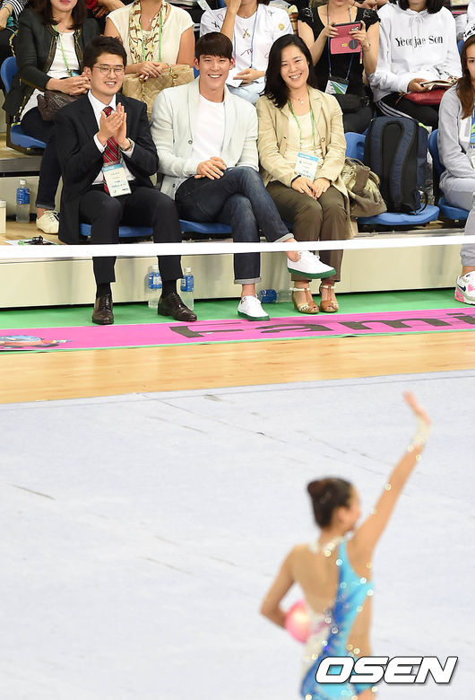 경기장을 찾은 박태환이 누나 박인비씨와 경기를 관전하며 환하게 웃고 있다.